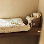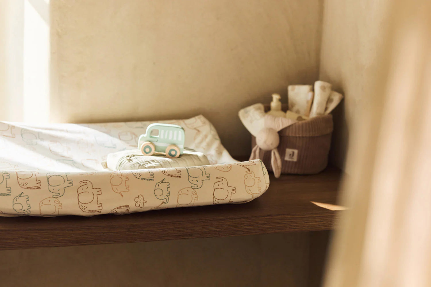 This changing mat cover makes changing your little one extra cozy. The cover is made of soft and stretchy jersey fabric and features a cute all-over print with lovely little elephants. The elastic edges ensure a perfect fit on the changing mat, so the cover stays in place during diaper changes. It fits perfectly in the nursery and makes every changing moment a little more fun!