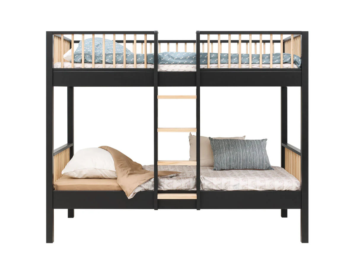 The frame is finished with a child-friendly, water-based opaque black and anthracite lacquer, creating a playful contrast with the varnished beech for a sleek Scandinavian aesthetic.