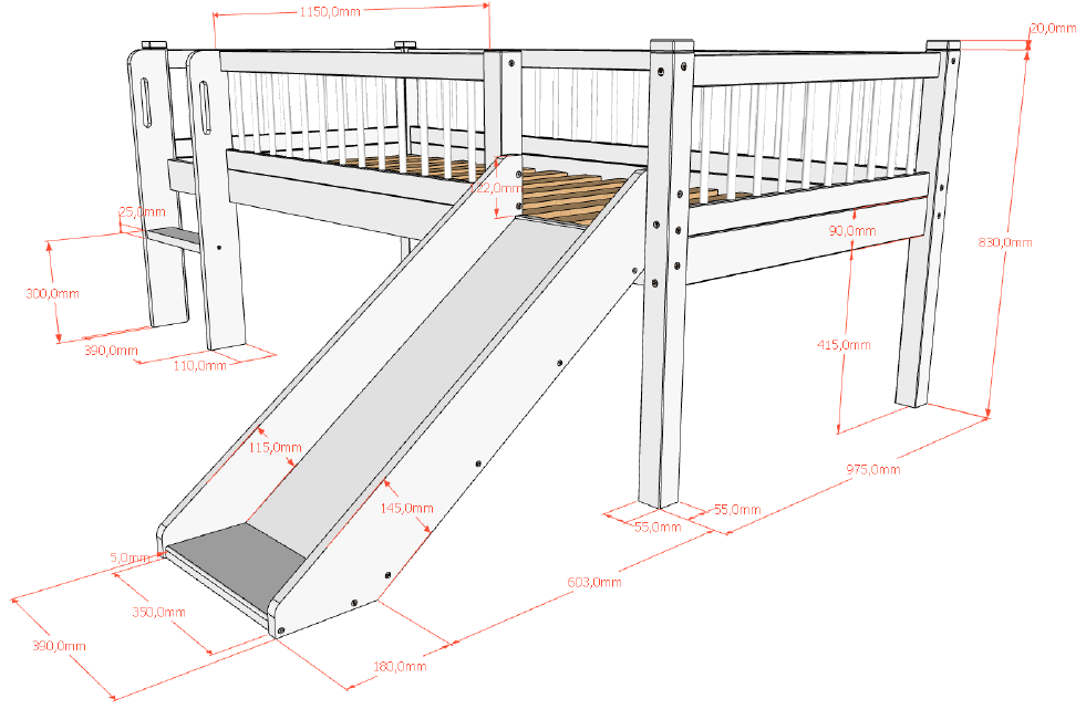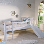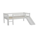 The FORREST BEECH low mid sleeper (90 x 200 cm) in white, with a ladder and playful slide, is crafted from high-quality European beech. It provides a cozy sleeping space while turning bedtime into an adventure with its fun slide. The open space underneath can be used for storage, making it ideal for keeping toys, books, or cushions organized in space-conscious rooms. Part of the FORREST collection, this mid sleeper combines thoughtful design with lasting quality.