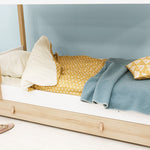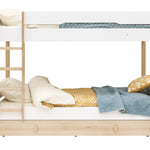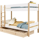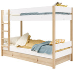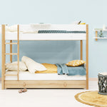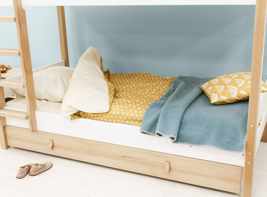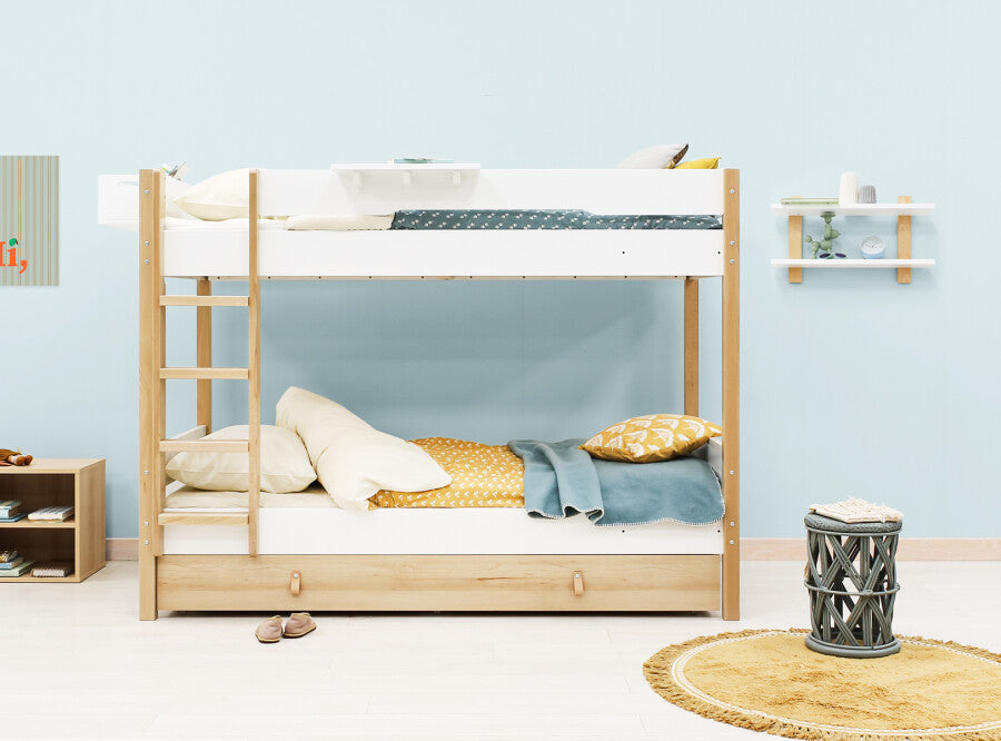 The Lucas bunk bed is a complete setup that includes a versatile trundle/drawer, perfect for extra sleeping space or convenient storage. Crafted from robust beech wood and sturdy MDF sourced responsibly from European forests, it combines durability with thoughtful design.