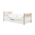 The Mika bed is made in a sophisticated combination of matte finished oak and white lacquered MDF. This lacquer is water-based and therefore child- and environmentally friendly. The bed comes with a slatted base, but without a mattress. For extra safety, a protection side can be placed, so that your child doesn't accidentally fall off the bed.